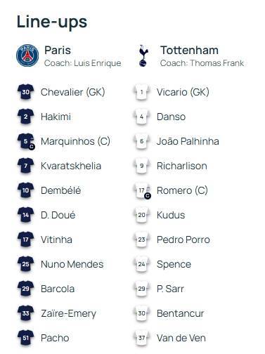 欧超杯-巴黎vs热刺首发:登贝莱、杜埃先发,波罗、理查利森登场